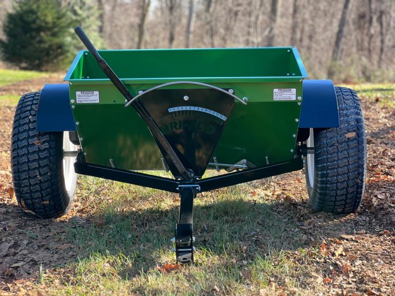 The Dri-Flo line is modeled after our Conestoga stainless-steel drop spreaders, aiming for more affordable quality option with a simpler build, leaving the box lid and 2nd agitator as options, also changing to 14 gauge painted steel box and removing the main auger clutch. They will have a thick axle to handle their full box capacities of lime and other heavy materials. Tall 23” x 12” tires and offer an all-terrain option for straddling rows or going down ATV trails.