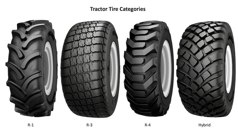 - Tread—Bars are great for traction: either the classic curved bar treads that pull tractors through soil, or hockey-stick shaped straight bars used at construction sites for hard surfaces. Blocks or "buttons" provide a lighter impact on turf. Advanced "hybrid" treads of blocks are arrayed in curved patterns to provide longer wear on pavement, good traction and a softer touch on turf.