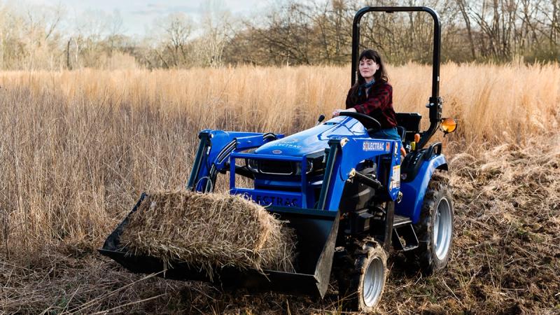 The 25 hp category e25G is a versatile, 4WD tractor, great for hobby farms, golf courses, sport fields, equestrian centers and municipalities that can run up to 6 hours depending on the load. The battery can be charged in 8 hours from a 220VAC, 30-amp (12 hours w/ 120VAC, 15-amp). It accepts all Category 1N/1 540 PTO implements, has position and draft control, and one standard rear hydraulic remote. A 1300 lb. capacity front loader; turf & industrial tires; and backhoe are now available.