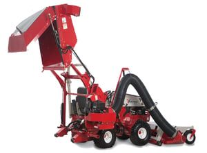 This vac model is powered by your tractor’s PTO, and can accommodate front or mid-driven mowers. The unit mounts on a CAT 1 three-point hitch. The gear box is coupled to the turbine assembly with a variable speed belt drive. Large diameter eight-inch intake and exhaust hoses assure clear suction. Trac-Vac also manufactures several self-powered models from 6.5 to 16 horsepower, and capacities from eight to 50 cubic feet.