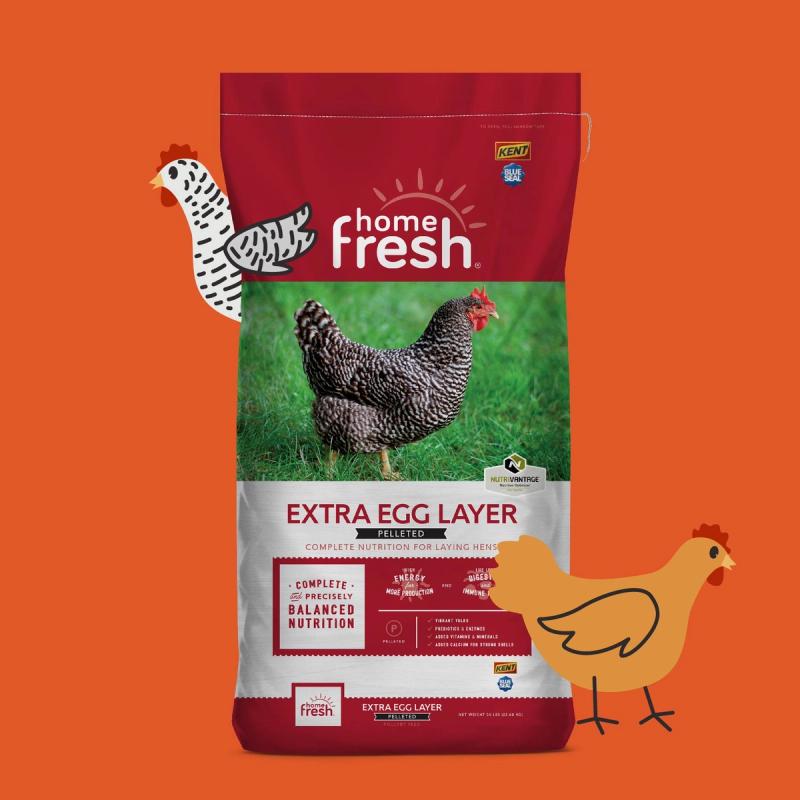 Home Fresh Extra Egg Layer feed is formulated for hens 20 or more weeks old, offering 17% protein for growth and reproduction. Its Yolk Rich technology promotes deep orange yolks and strong shells. A Kent Nutrition Group study found hens on Home Fresh ate less feed yet produced more nutritious eggs with higher Vitamins A and E, Manganese and Zinc compared to a leading brand.