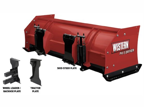 With the new PILE DRIVER pusher plows, you can scrape, push, and stack snow in one pass. The special steel trip-edge design provides a cleaner scrape while protecting you and your equipment, and the steel cutting edge is center punched, resulting in an improved service life. These pushers quickly and easily attach to skid-steers, backhoes, wheel loaders, and tractors requiring only the use of interchangeable attachment plates.