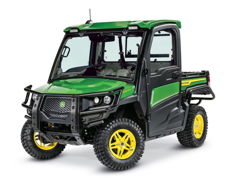 The John Deere XUV835R Signature Edition Gator Utility Vehicle offers automotive-inspired features: genuine leather seats, a touchscreen infotainment system, a high-end audio system, and a rear-facing camera. This UTV combines reliability with additional safety features such as bumper and fender guards, and fender flares for optimum protection. The XUV835R gets the job done with its easy-to-read instrument panel, smooth power steering, and responsive four-wheel drive system.