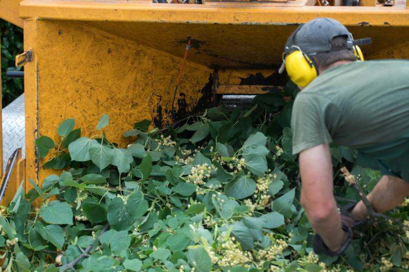 Begin by feeding branches into the hopper. Stand to the side and never directly in front of the feed chute. Use a push stick or long branch to push smaller branches, twigs and leaves into the hopper so you don’t have to put your hands near the feed rollers. Most woodchipper accidents happen when people push material into the machine with their hands, so keep yours far away from moving parts.