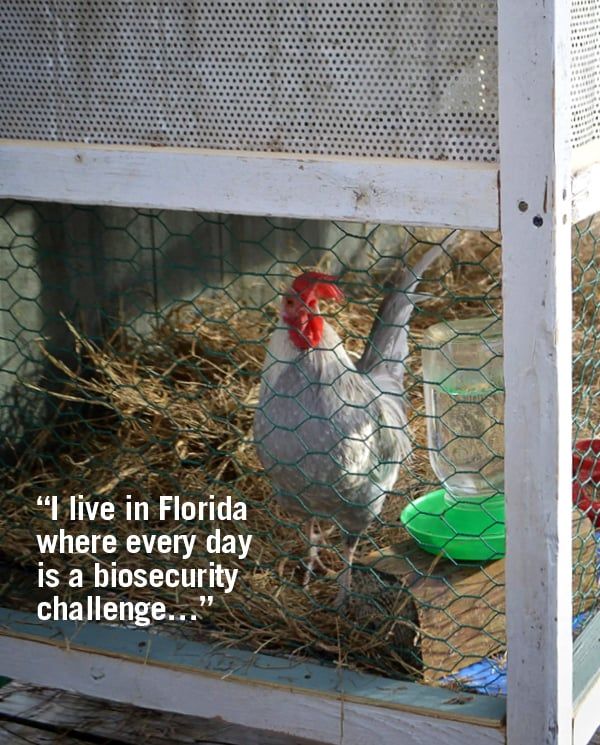 I live in Florida where every day is a biosecurity challenge due to insects! We’re talking insects like two-inch long Palmetto Bugs, mosquitoes, and many species of Darkling Beetles. When I first began chicken-keeping, I (thought) they were to be used at pest control. I found out the hard way that allowing my birds to freely eat insects because “it’s good for them” was a mistake.