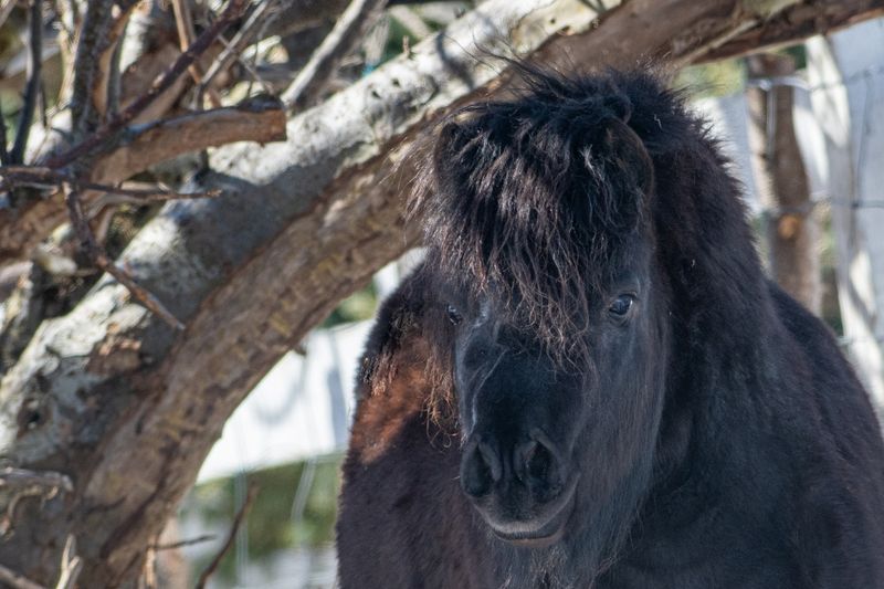 A small black Newfoundland pony stands in a horse pen.