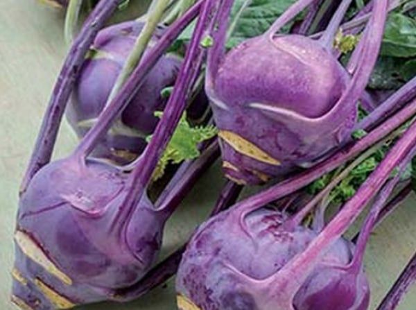 Kohlrabi stems can be eaten fresh like a piece of fruit. The bulbs can also be shredded for salads or cooked with a sauce as a tasty side dish. Konan Hybrid is a 2016 All-American Selection winner that produces crunchy, lunar pale-green bulbs. The 18-inch-tall plants are robust and insect resistant. Another great variety is Purple Vienna Organic. Eat the green leaves like kale and the white-fleshed bulbs like broccoli. Seeds are available from www.Burpee.com.