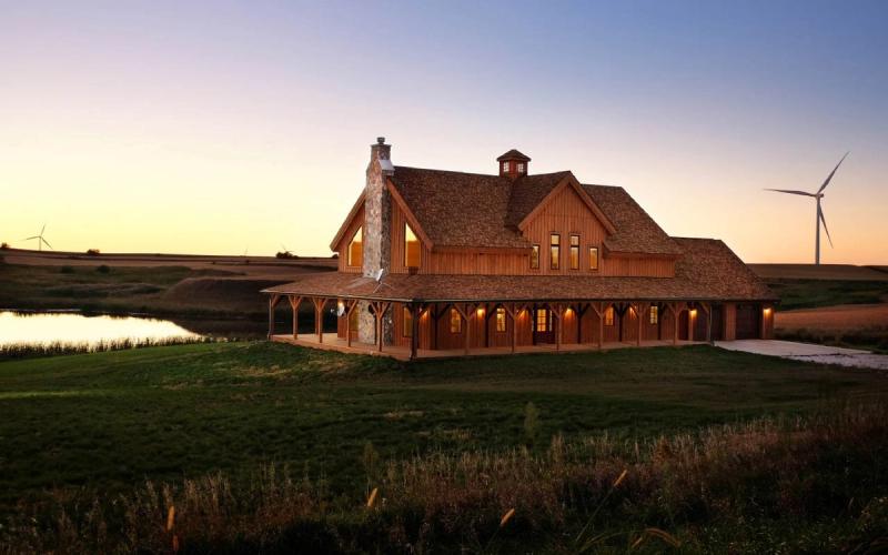 This home by Sand Creek Post & Beam shows the true versatility of barn designs. While it started as a historic barn design, the homeowners added modern touches to make it truly their own. The wrap-around porch keeps out the hot sun while providing the perfect place to enjoy coffee and the vista views. The dormers not only add character to the design, but allowed for even more room in the loft for the huge master suite. The large cupola is the perfect finishing touch outside, tying together all the elements while maintaining the barn theme. The board and batten siding is stained a pleasing natural color and blends in perfectly with the countryside. It truly is a thing of beauty at sunset.