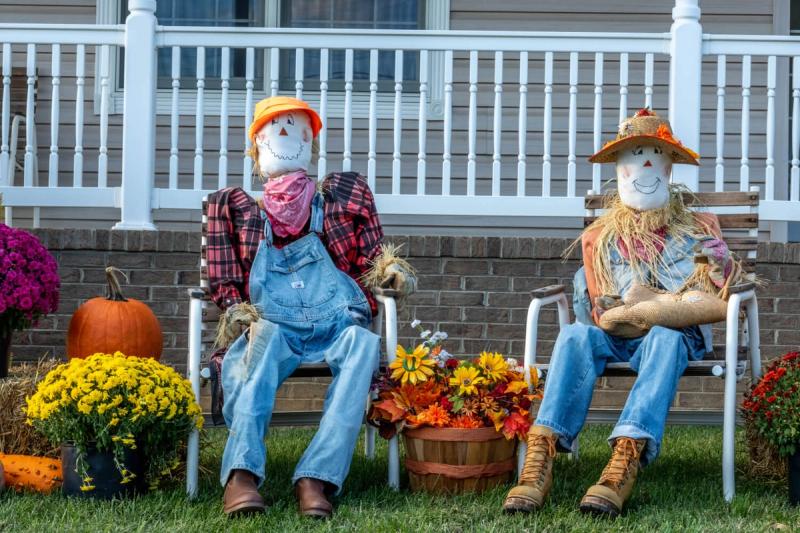 Since it’s October, it should be easy to find wigs for your display at any good will or Halloween store. You can place the scarecrows in lawn chairs or lean them against straw bales with a few pumpkins and potted flowers and voila: a cute replica of the whole family.