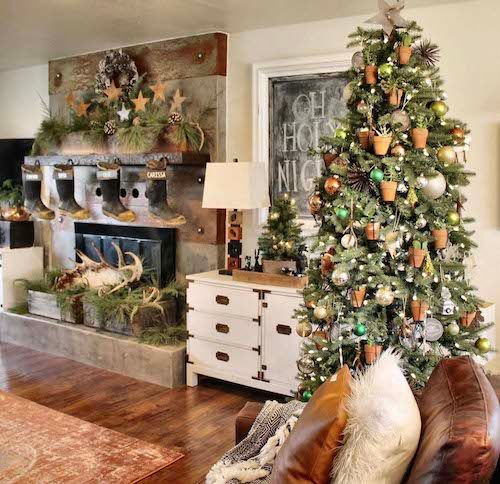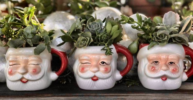 Julia’s fire boots in lieu of stockings to honor her family's fire fighting occupation, vintage Santa mugs made into planters, and mini terracotta pots as ornaments.