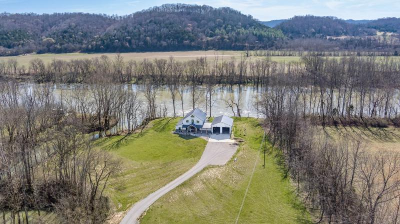 An enchanting blend of rustic charm and luxury, this newly built three-bedroom, three-bathroom home in the Rivers Edge subdivision of Burkesville, Kentucky, is a stunning modern farmhouse design. Spanning more than 3,200 square feet on more than 9.28 acres, this home welcomes you with a grand double-door entry into an open-concept foyer, where vaulted ceilings with exposed beams and large windows frame the breathtaking views of the forested hills of Cumberland County.