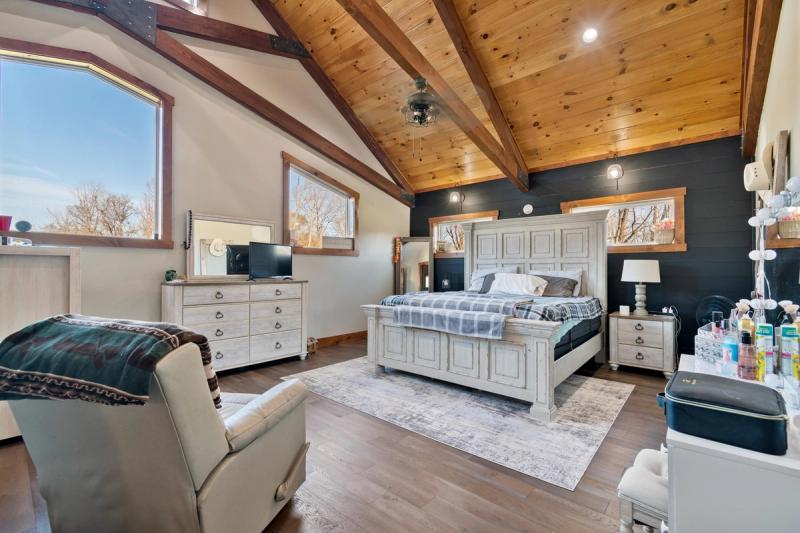 The modern farmhouse aesthetic is complemented by dark oak cabinetry, granite countertops and stainless-steel appliances, while a stone gas fireplace adds warmth to the living space. The first-floor features two spacious bedrooms and two bathrooms, and the second-floor primary suite boasts an oversized, custom-tiled shower and offers a private retreat for parents.