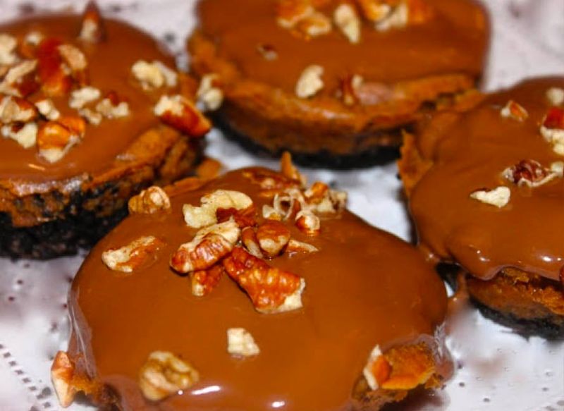 - Remove cheesecakes from pan and top each with a spoonful of chocolate ganache and hazelnuts.