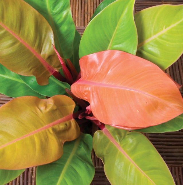 Philodendrons are popular houseplants that thrive indoors in almost all settings. The pleasant green foliage is a welcome addition to any room. Philodendron ‘Prince of Orange’ offers the same easy-care dependability, with the bonus of colorful leaves. The new leaves unfurl in vivid orange and slowly change to pale green as they mature. Unlike the traditional Philodendron, this variety is not vining. The stiff, dark stems hold the leaves upright.