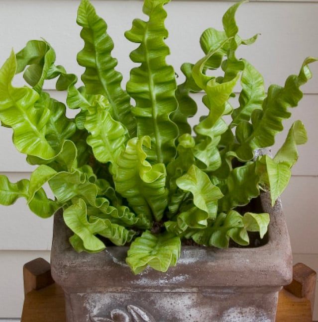 Its wavy leaves arise from a central rosette, giving the plant a “bird’s nest” appearance. A trendy fern that’s resilient in most home environments, it enjoys soil that is kept evenly watered. This plant is one of the best air-cleaning plants, so put it in a room where you spend some time. Available from www.logees.com.
