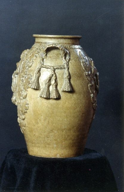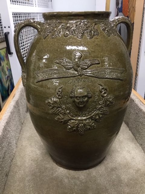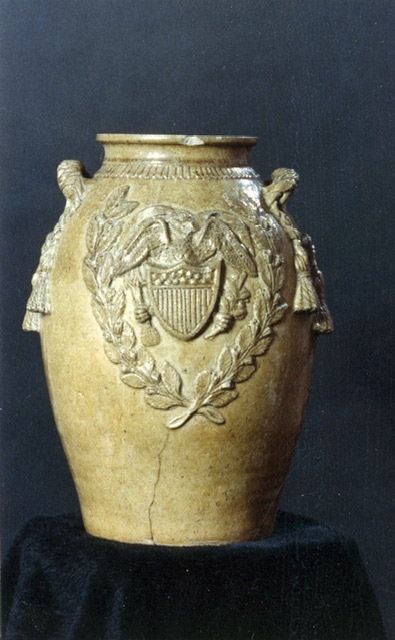 A jar made by John Lehman in early 1870’s at Jacob Eichelberger’s shop near Oxford, Alabama. Decorated with U.S. seal, winged angel and tassels.