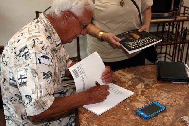 Gary Price signing a copy of the book he co-wrote with his wife Martha, The Illustrious Folk Pottery Shops.