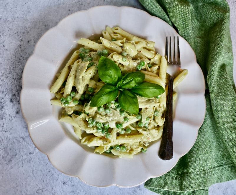 Creamy Artichoke, Pea, and Pesto Pasta Salad
