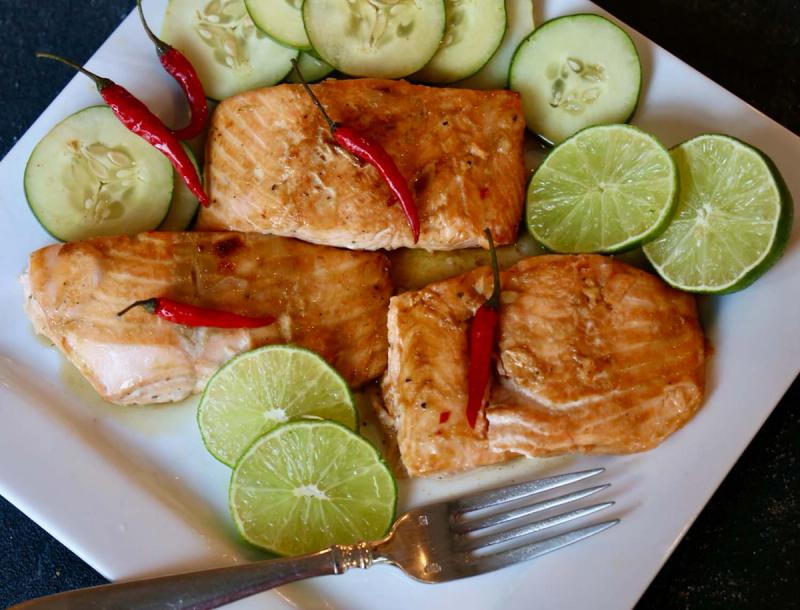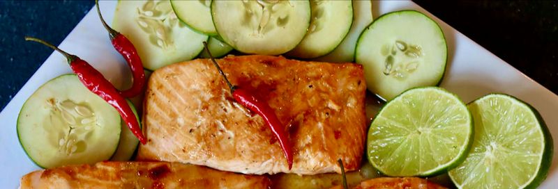 - Plate the salmon fillet with the cucumber slices on the side. Spoon the marinade from the cucumber over both the salmon and the cucumber.